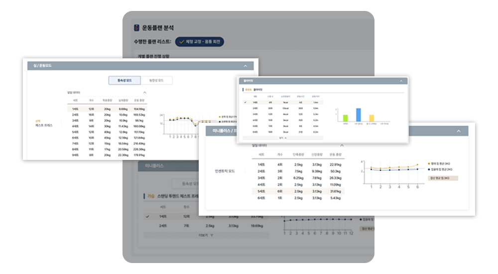 회원의 운동 기록과 근력 변화 추이를 그래프로 실시간 확인하세요